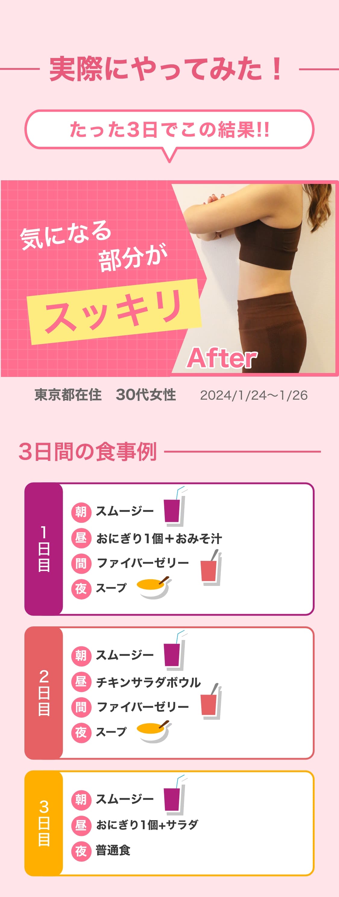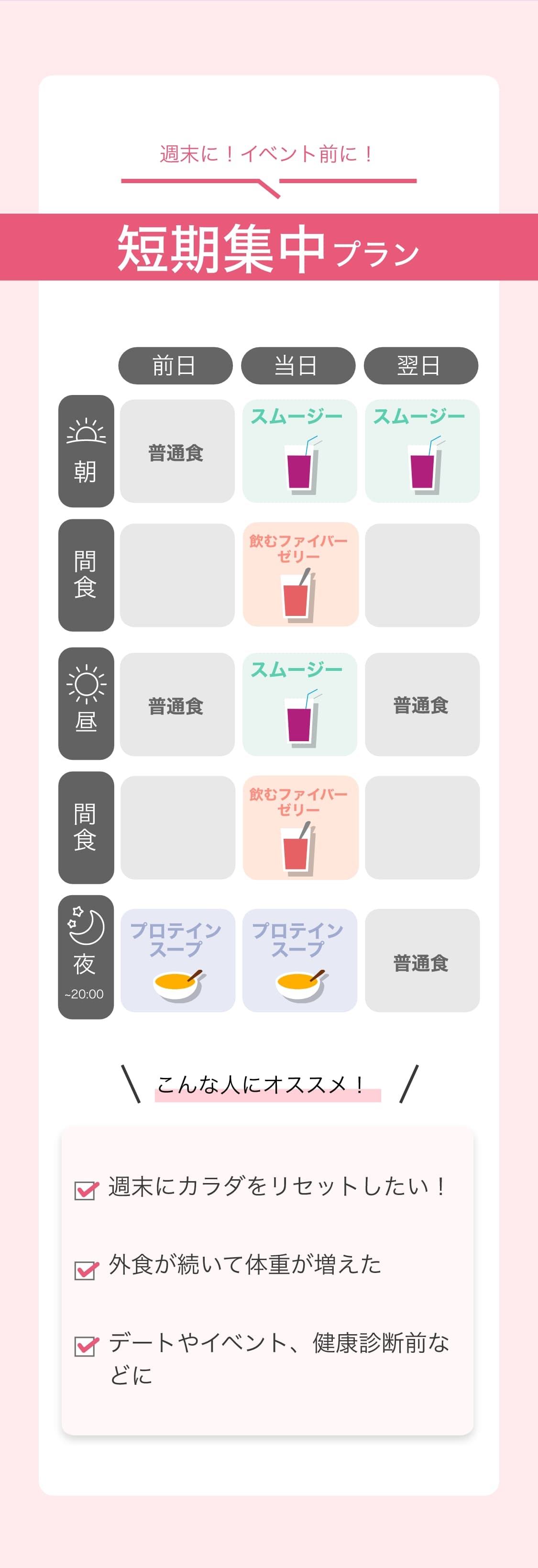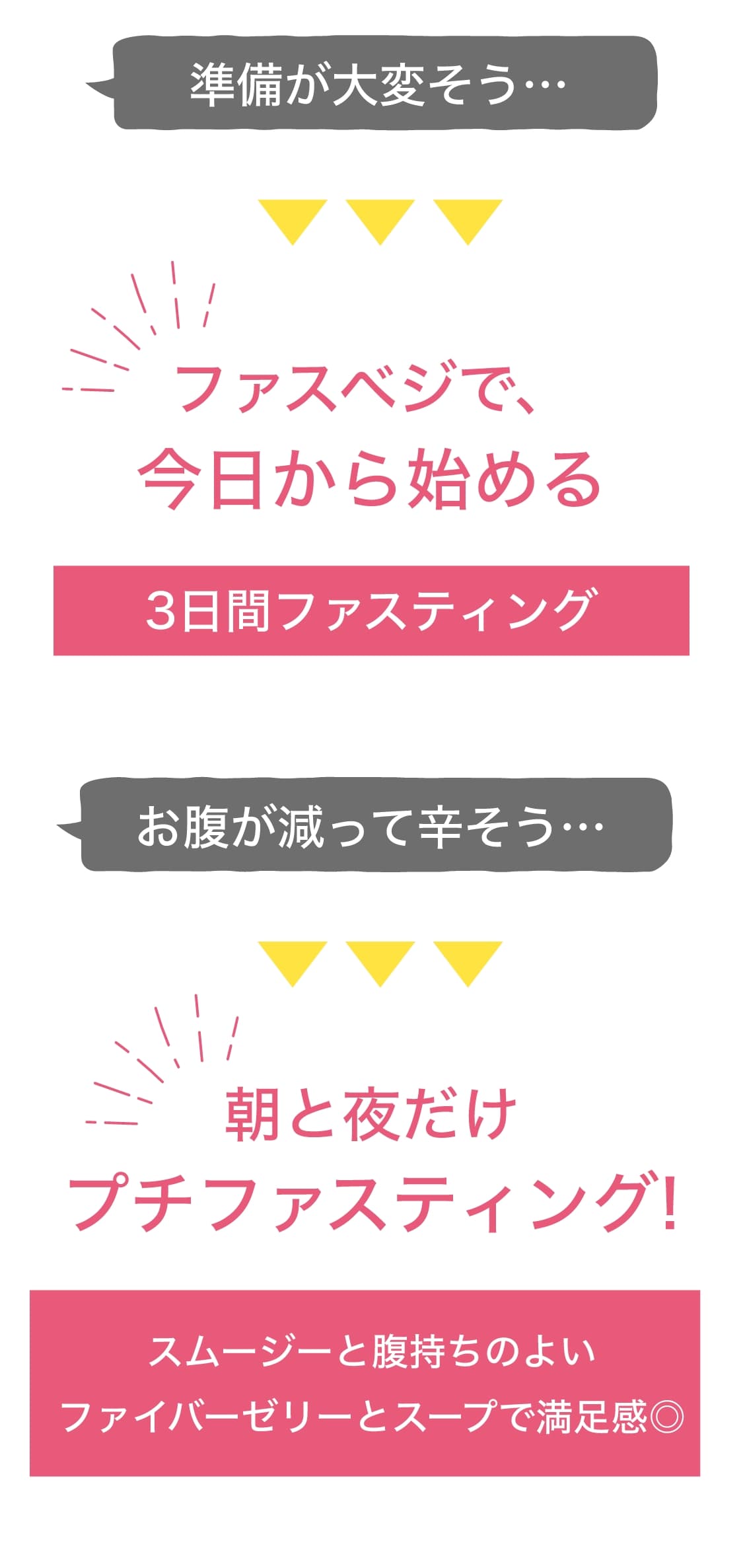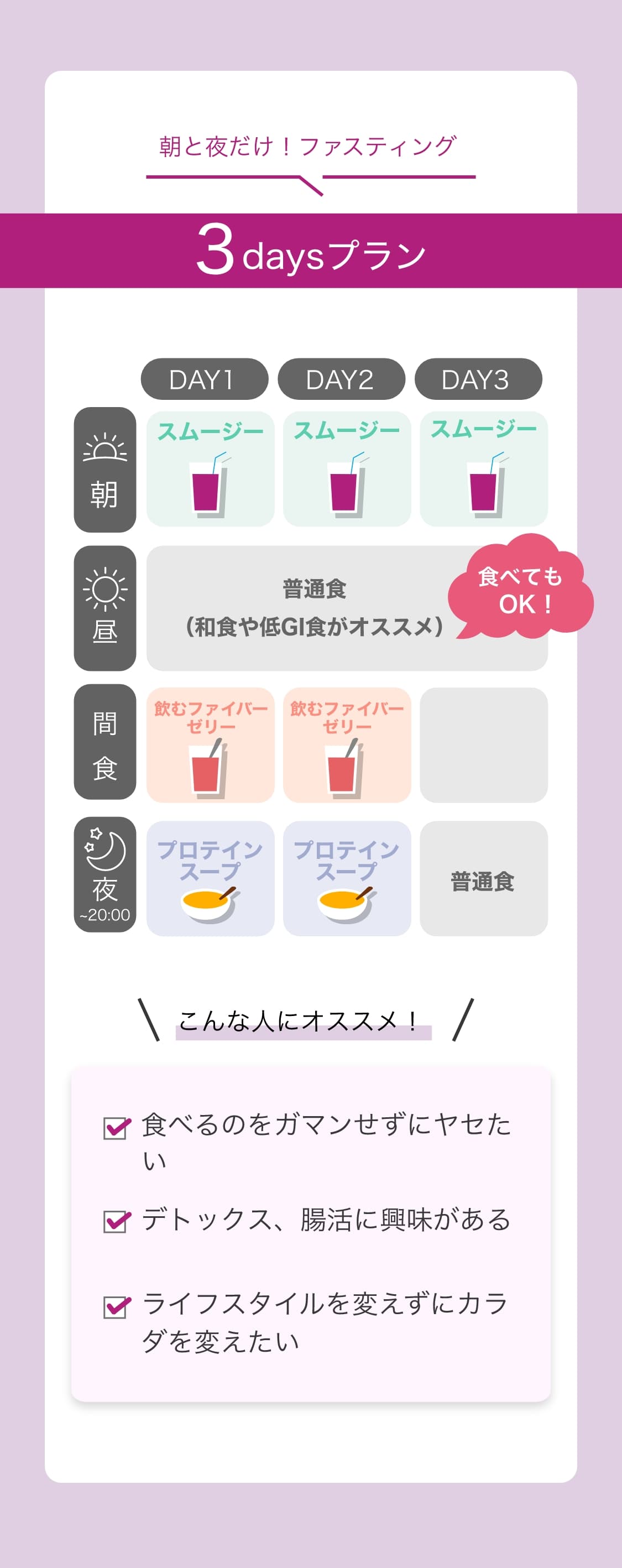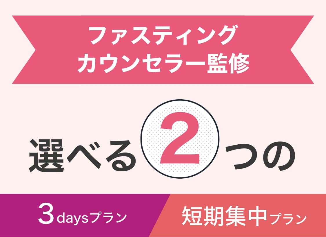 どちらもファスティング効果が期待できます。ご自身のライフスタイルでどちらのプランにするかをお選びください。はじめての方には、「3daysプラン」をオススメします。