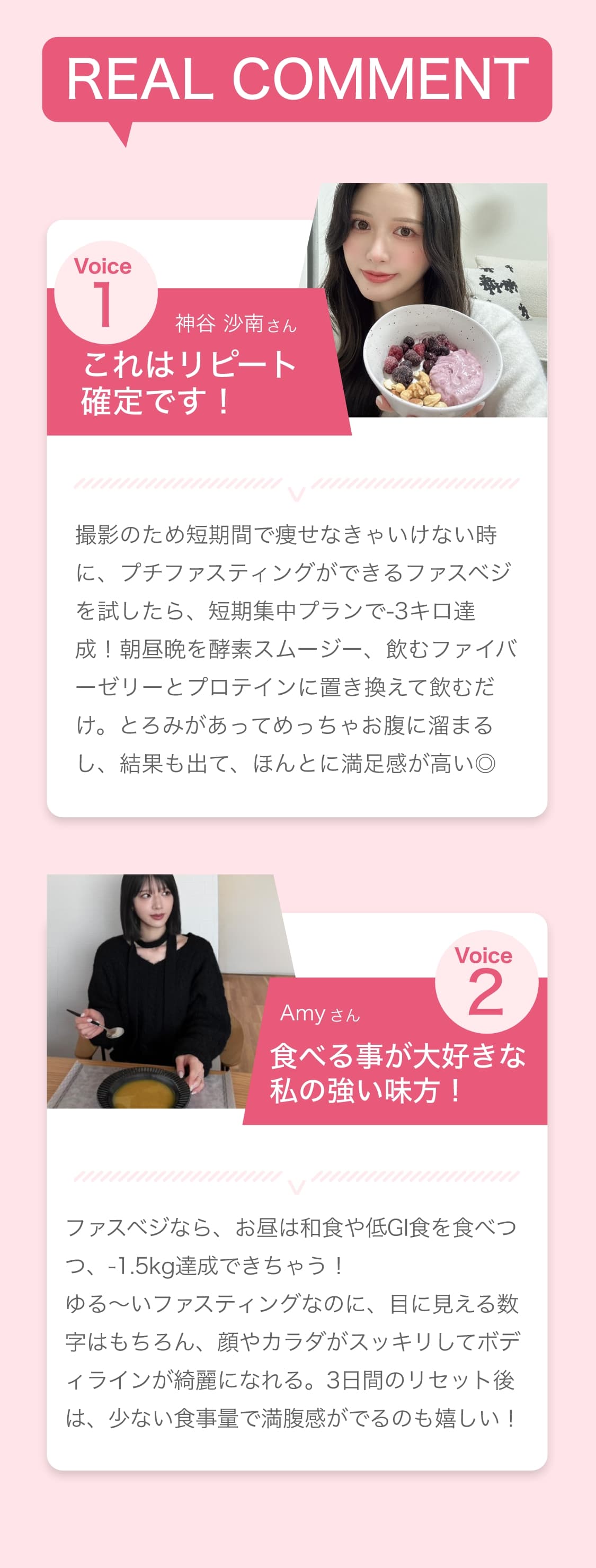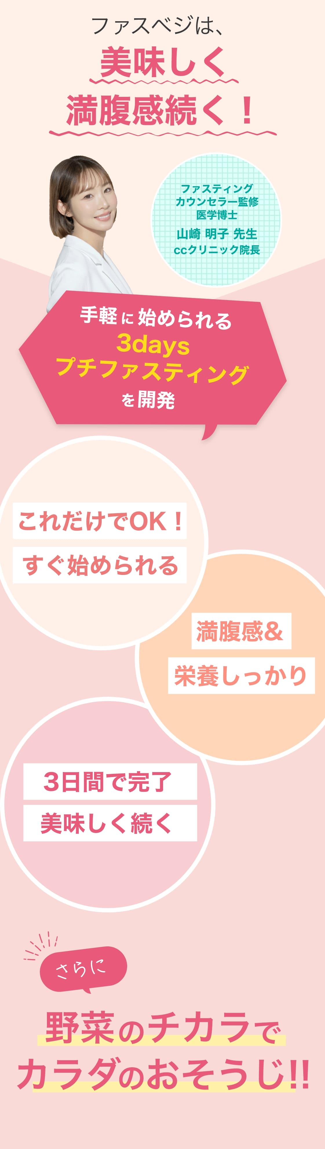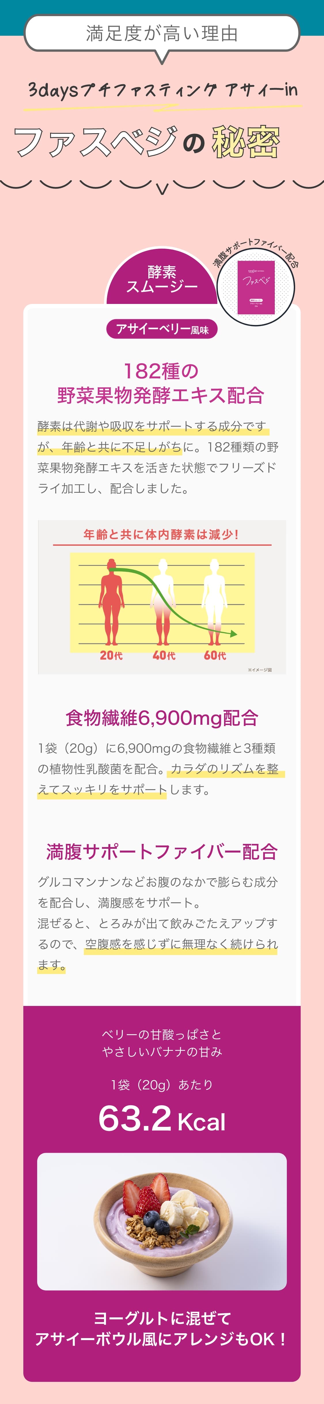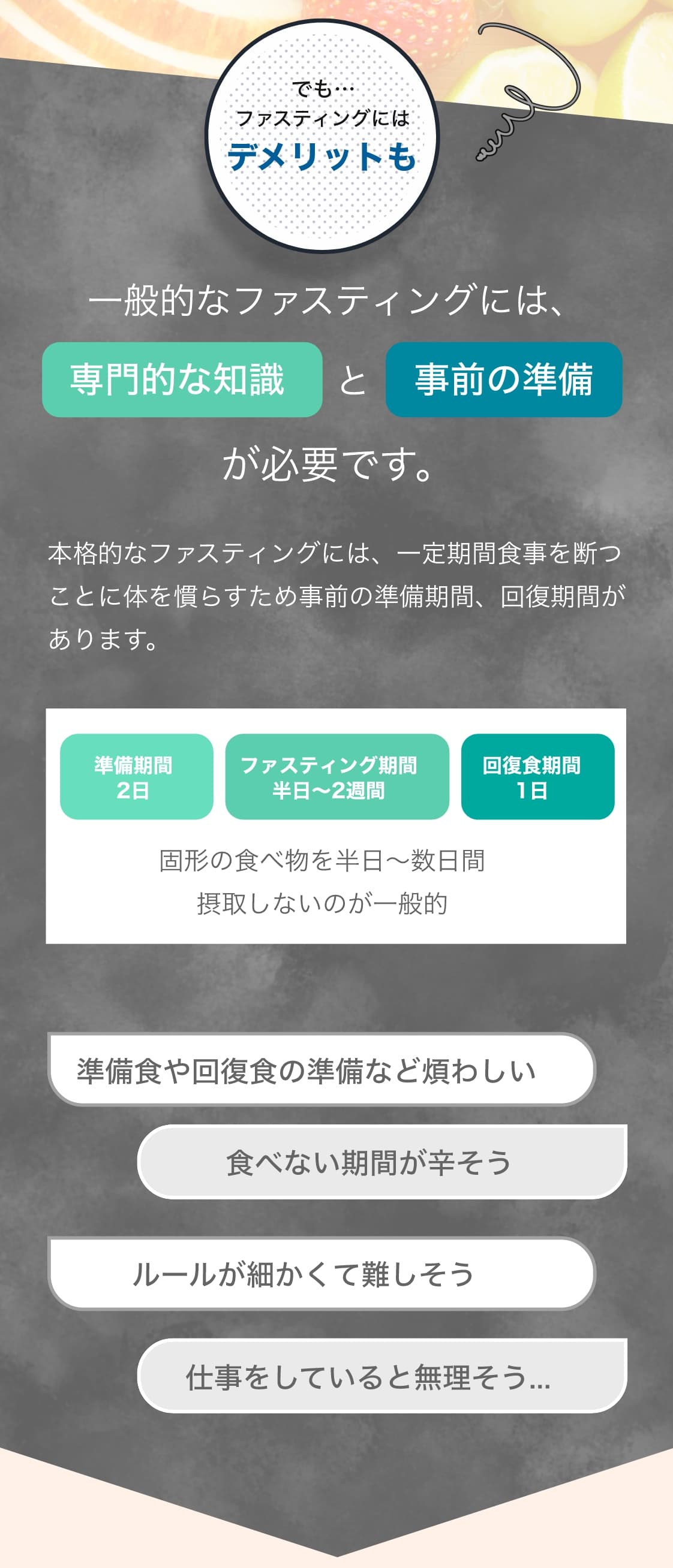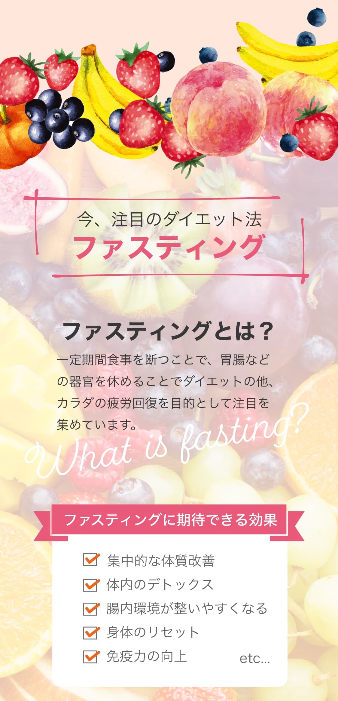 どちらもファスティング効果が期待できます。ご自身のライフスタイルでどちらのプランにするかをお選びください。はじめての方には、「3daysプラン」をオススメします。