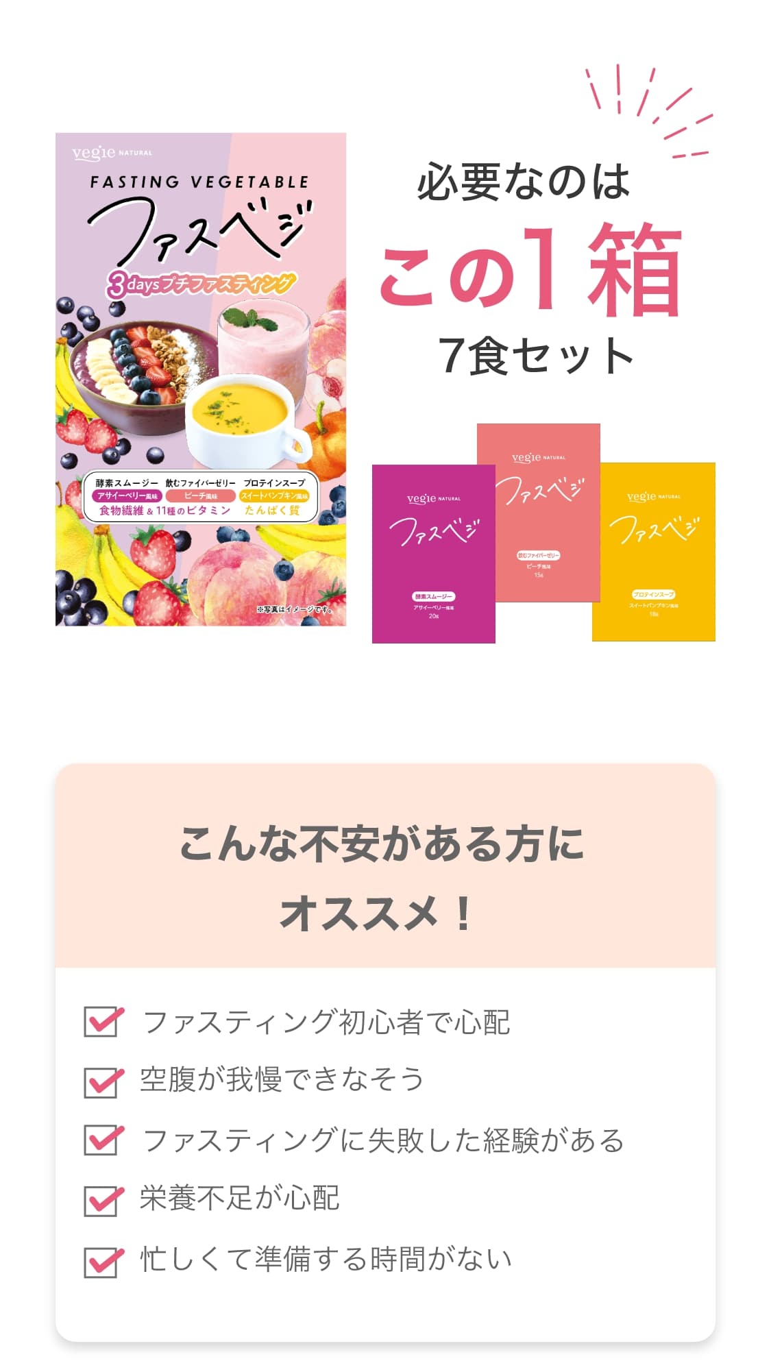 短期集中プランを含めた「3daysプチファスティング」1箱分を使用した場合、準備食や回復食は必要ありません。ただし、プチファスティング後は野菜スープやおかゆ・うどんなど、消化の良いものをオススメしております。